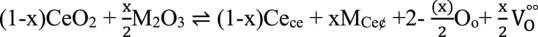Cations such as Sm3+, Gd3⁺, and Dy3⁺ are utilized to create the Vo. Usually, this replacement takes place during the synthesis process. The Kröger-Vink notation is a way to express the balance between M3+ (Ce ¢), Ce4+ (Cex), and Vo.