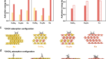 Many electrocatalysts such as metal catalysts (e.g., Fe, Ni, Ag, Co, Zn, Sn, Sb, Au, and others)12,25,27, single atoms alloy28, transition-metal nanostructures29,30, oxide derived metal catalysts9, and bimetallic/heteroatomic catalysts have been studied for HMF electrochemical hydrogenation reaction in search of higher selectivity and production rate. Among these, heteroatomic catalysts, distinguished by the intimate co-localization of two distinct atomic species within a shared matrix, have attracted considerable scientific interest. Heteroatomic catalysts demonstrate a distinct bimetallic synergistic effect, which has been proven to greatly enhance the efficiency of HER31,32,33, oxygen evolution reaction (OER)34, hydrogenolysis35, and other vital electrochemical processes, including CO2 electrochemical reduction, glucose oxidation, and nitrate reduction reactions36,37,38. For example, it has been reported that introducing single-atom Ru into Cu significantly promotes HMF electrochemical reduction by accelerating the dissociation rate of water molecules to generate H* species, thereby enhancing the hydrogen-mediated HMF reduction reaction28. In general, the intrinsic properties of individual atoms play a pivotal role in defining the overall catalytic behaviour of the catalyst in the targeted reaction, and an efficient catalytic system for HMF can be designed by preparing a heteroatomic structure where atoms can create favourable binding sites for adsorbed hydrogen (Hads) and HMF molecules respectively5.