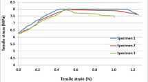 Following 28 days of water curing, the compressive stress-strain curves for the HPDC cylindrical specimens measuring 150 × 300 mm are displayed in Fig. 8. After three repetitions, compressive strengths at 28 days were 65.6, 64.7, and 55.2 MPa obtained from the cylindrical specimens. Based on the initial stiffness of the elastic region of curves, the elastic modulus of 25.11, 21.88, and 24.00 GPa were obtained for HPDC specimens. The literature obtained a similar compressive strength range for HPC with no coarse aggregate content31,32,33. Uniaxial stress-strain curves of HPDC mixtures at 28 days are shown in Fig. 9a. Direct tensile strengths of 7.94, 8.15, and 8.24 MPa were found, corresponding to the tensile capacity of 0.3–0.6%. The uniaxial tensile-to-uniaxial compressive strength ratio is around 0.12–0.13 for the HPDC mixture tested in the present study. The splitting tensile results for HPDC mixtures were 10.88, 9.0, and 10.50 MPa. This shows that the splitting tensile-to-uniaxial compressive strength ratio ranges from 0.14 to 0.17. A comparison between the strain capacity of the property HPDC mixture and the mixture presented in the previous investigation, which has a volume fraction of steel fibers of around 2.0%, is shown in Fig. 9b. The analysis shows that in the field of DHPC mixture, the present HPDC mixture performs appropriately.