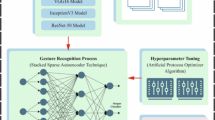 HGR is employed in human–robot interaction (HRI) to form user interfaces that are user-friendly and beginner-friendly. Sensors leveraged for HGR comprise external sensors, namely video cameras, and wearable gadgets, like data gloves6. Video-based GR tackles such problems; however, it poses a novel issue: finding the hand and separating it from the background in a sequence of images is a challenging task, specifically when there are variations in lighting, obstructions, fast movements, or the presence of skin-colored objects in the background7. Data gloves may deliver precise movement and hand posture measurements; however, they need wide calibration, limit natural hand motion, and are costly. Creating HGR systems, like sign language applications, is crucial to address the communication barrier with individuals who are unfamiliar with sign language8. Technology that spontaneously interprets hand gestures into audible speech or text for a non-signing person to understand can assist in reducing this barrier. Because of the significant advancement in camera technology and AI, CV-assisted gesture detection systems have become a commonly studied research area currently9. Deep learning (DL) techniques have received considerable attention from the academic community and businesses swiftly, as they are powerful and have attained better performance in the HGR area10.