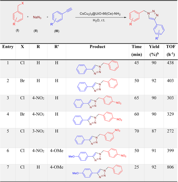1. Reaction conditions: I (0.5 mmol), II (1 mmol), III (1 mmol), water (2 mL), and CsCu2I3@UiO-66(Ce)-NH2 catalyst (10 mg, 0.87 wt% Cu). aPurified yield. bTOF = (Number of moles of product formed) / (Number of moles of catalyst × Reaction time).