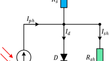 where \({I}_{PV}\) is the output current of the photovoltaic cell, \({I}_{ph}\) is the photogenerated current, \({I}_{d}\) is the saturation current, \({V}_{PV}\) is the output voltage of the solar cell, \(A\) is the ideal factor, \(K\) is the Boltzmann constant, \(T\) is the immediate temperature, \(q\) is the amount of electronic charge, \({R}_{s}\) is the series resistance, \({R}_{p}\) is the parallel resistance, \({N}_{p}\) is the number of parallel cells, and the number of parallel cells is the following: \({N}_{s}\) Indicates the number of batteries in series. The calculation equation of photogenerated current \({I}_{ph}\) is shown in Eq. (17).