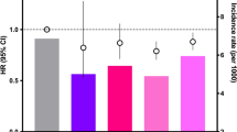 When interactions between age at smoking initiation and total PY of exposure were examined, significant interactions were found in relative risks of MI, stroke, MI or stroke, and death in the multivariate model (p for interaction < 0.001 for each) (Fig. 4). There was a trend toward a greater increase in adjusted PY-dependent risks of MI, stroke, and MI or stroke in subjects with earlier ages at smoking initiation. Smokers with age at initiation < 20 had the highest elevation in risk of MI or stroke for ≥ 20 PY smokers (HR 2.43 [2.26–2.60]) relative to < 10 PY smokers, and the lowest corresponding relative risk (HR 1.26 [1.23–1.29]) was seen in subjects who started smoking at age ≥ 30. Meanwhile, adjusted relative risks of all-cause death did not show a consistent trend aside from a trend of PY-dependent increase in risk for smokers with age at initiation ≥ 30.