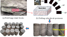 The Sichuan Basin and its surrounding areas play a very important position in China’s shale gas resource exploration and development pattern, with the highest resource and recoverable amount, and is the main battlefield for the strategic development of shale gas resources in the country. Currently, more than 95% of shale gas production comes from the Upper Ordovician Wufeng Formation and Lower Silurian Longmaxi Formation in this region, and these two main purpose formations are highly similar to the geological conditions of the Haynesville Shale in the United States, which is important guarantee for the sustainable development of China’s shale gas industry in the future. The shale samples in this experiment were collected from the outcrop stratum of black shale in Longtou Town, Changning, Sichuan Province. This outcrop is a natural extension of the shale reservoir of the Lower Silurian Longmaxi Formation. The Ning 201 shale gas well, which is 30 km away from this area in a straight line, is the first shale gas well with commercial value in China. Shale gas block of Changning is the earliest national-level shale gas demonstration zone in China. The shale reservoir thickness was between 100 and 500 m, where shales of Upper Ordovician Wufeng Formation and Lower Silurian Longmaxi Formation were widely developed, which has good resource development potential. These shales were formed in deep-water continental shelf sediment controlled by continental margin depression at a depth of 200 m. Shale reservoirs with dark mudstone debris deposition and highly developed bedding structures. The surface of the rock core shows obvious alternating layers of thin and thick layers, rich in biological fossils, and banded pyrite. Other interlayers such as calcium, siliceous, and fossils are interspersed inside. Under CT scanning, the layered structure of shale gray white alternation can be clearly seen, and rock minerals were mainly quartz and dolomite. The content of both was over 70%18. Large shale with clear stratification was selected and brought back to the laboratory (Fig. 1a), and the rock samples used for tests were drilled from the same full-diameter rock to ensure similar physical properties. To ensure the accuracy of the bedding inclination, we mainly prepare cubic shale specimens with bedding, and the angle between the bedding and the horizontal plane of the block is determined by a protractor. During the coring process of the standard specimen, we ensure that the drill bit remains consistent with the horizontal plane of the rock block to obtain shale specimens with different bedding angle (Fig. 1b). The machining accuracy of the sample strictly follows the testing standard of ISRM of the International Society of Rock Mechanics. The flatness of the two end faces is controlled within ± 0.05 mm, and the vertical deviation is controlled within ± 0.25°. The shale specimen of 50 mm*100 mm is prepared, then dried and sealed with plastic wrap.