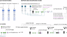 We built two predictive models, based on regularized logistic regression models with elastic net based regularization10. Note that the case–control cohorts defined in PheWAS for identifying significant features are not used for predictive modeling. Instead, the broader cohort which matched inclusion criteria (n = 996,384) is used in predictive modeling. The first model was trained on the full population that is older than 40 years old (N = 527,027). The second model was trained and validated only on patients with no known or documented pancreatic conditions or cross-sectional imaging. We trained with predictive model with regularized Logistic Regression to estimates the probability of pancreatic cancer by \(P\left(y= 1\right)=1/(1+{e}^{-({\beta }_{0}+ {\sum }_{i=1}^{m}{\beta }_{i}{x}_{i})}\)), where \({x}_{1},\cdots , {x}_{m}\) are feature variables from EHR, \({\beta }_{0}\) is the intercept, and \({\beta }_{1}, \cdots , {\beta }_{m}\) are the coefficients. We tuned the regularization penalty by elastic net (the combination of L1 and L2 regularization). To mitigate the class imbalance shown in Table 1, we applied balanced class weight in logistic regression model. During the development stage, we split the development data set into a training cohort and held-out validation cohort and performed fivefold cross-validation on the training cohort with a 20% validation set. We then reported results on the temporally separate (new patient) held-out cohort described in the previous section.