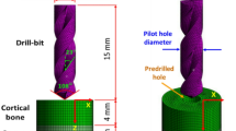 For each calculation, the thermal conduction coefficient hc between the bone cement and the Co28Cr6Mo cylinder was varied between 1,000 and 10,000 Wm− 2 K− 1 in steps of 50 Wm− 2K− 1. All other parameters were kept identical for all calculations. Time-temperature curves for the position where the maximum surface temperature was measured in the experiments were calculated for a simulation time of 10 s including 1 s of heating. The calculated temperatures were then compared with temperatures measured in the experiments by determining the mean square error (MSE), the difference in average temperature increase rate and the maximum deviation inside a time segment from 1.5 s to 4.5 s. During this period, surface temperatures increase significantly and convection losses play an insignificant role, and thus were neglected in the calculations. Values determined for hc were deemed acceptable if they produced an absolute maximum deviation of less than 2 K, a maximum error of ± 0.68 K/s for the temperature increase rate and a maximum MSE of ± 0.3 K.
