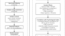 The frequency-domain power spectra of the channels in each trial were calculated via fast Fourier transform (FFT) and averaged across trials, resulting in a multichannel power spectrum (channels × frequency) for each participant. The frequency resolution of the FFT was set at 1 Hz, the temporal resolution was set at 100 ms, and the data were tapered via a 1000 ms Hanning window before the FFT33,34,35. For statistical analyses, an independent samples t-test between the GAD and HC groups was conducted. The result was corrected for multiple comparisons via a cluster-based permutation test, with the significance level of correction set at α = 0.05 (two-tailed), the distance for defining electrodes as neighbors set at 50 mm, and the number of permutations set at 500036. The cluster-based permutation test is a nonparametric statistical method used to detect significance and clustered effects in EEG and is less conservative than the false discovery rate (FDR) or Bonferroni correction, especially when the sample size is large37.