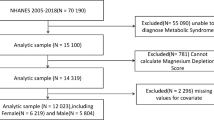 The MDS was calculated to evaluate overall body magnesium status, as described elsewhere12. The MDS incorporates four factors: diuretic use (one point for current use), proton pump inhibitor (PPI) use (one point for current use), renal function (one point for 60 mL/min/1.73 m2 ≤ estimated glomerular filtration rate [eGFR] < 90 mL/min/1.73 m2; two points for eGFR < 60 mL/min/1.73 m2), and alcohol consumption (one point for heavy drinking). In this study, MDS values were categorized into three groups: “none to low” (MDS = 0–1), “middle” (MDS = 2), and “high” (MDS = 3–5) to facilitate interpretation and application. The quantity and types of food and beverages consumed were assessed using NHANES data from two 24-hour recall interviews. The first 24-hour personal interview was conducted in the Mobile Examination Center (MEC), and the second was conducted by telephone approximately 3–10 days later, according to the survey procedure. Total dietary magnesium intake was estimated by averaging the data from these two 24-hour dietary recalls.