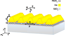 The two ribbons have the same height of h but different widths of \(W_1\) and \(W_2\). The Au ribbons are arranged on MoS2 monolayer and the whole structure is placed on silica (SiO2) substrate. The incident light illuminates the structure normally with its magnetic field normal to the incident plane (TM-polarization). Complex refractive index of MoS2 and gold are taken from28 and29, respectively. The constant refractive index of SiO2 with \(n_{{\hbox {SiO}}_{2}}=1.45\) is from30. The Floquet periodic boundary condition is applied to the terminating zy-planes of the unit cell, with a period P. To accurately simulate the sub-nanometer thickness of MoS2 (0.615 nm) and avoid mesh-related challenges, it is modeled as a transition boundary. Throughout the paper, the height of the ribbons, \(h=100\) nm is taken as a constant, and \(S_1\) is considered to be equal to \(S_2\).