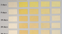 Paper degradation commonly results in changes in colours, which were evaluated by measuring L*, a*, and b* parameters18. The restoration materials, i.e., the second type of sample, were found to be darker and more yellowish after both dry- and moist-heat degradation, especially under the condition of moist-heat degradation, as shown in Fig. 3a. The colour changes in Table 1 also support this finding. Compared to the samples before degradation, the L*, a*, and b* parameters after dry-heat degradation showed statistically significant differences (p ≤ 0.05), while after moist-heat degradation, they exhibited highly significant differences (p ≤ 0.01). ΔE* of this model paper is above 5 before and after degradation under both conditions, belonging to the significant changes, according to National Bureau of Standards (NBS) units of colour difference36. The colour change under moist-heat degradation was greater than that of dry-heat degradation. Given that both cellulose and hemicellulose in the paper can degrade and yield a large number of typical chromogenic groups, such as carboxyl and carbonyl groups37. It is also possible that the polysaccharide, i.e., the presence of starch in this model sample, could also degrade and produce the chromophore group18.