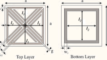 Recently, several wideband FSS structures have been designed in10,11,12,13,14,15,16,17,18,19,20,21,22,23,24,25,26,27,28,29,30,31. In order to achieve a miniaturized size, 2.5D FSS with vias connecting the top and bottom layers is reported in10,11,12. The FSS is constructed in a 2D framework to reduce cost and make fabrication easier. Multilayer arrangements with multiple substrate and conductive layers are reported in13,14,15,16,17,29. A mesh grid with a dimension of 0.07λ0 is sandwiched between a square loop with interdigitated bends13. A circular loop is embedded on the top and bottom layers in14, while a square grid is developed in the centre layer to achieve miniaturization of 0.07λ0.