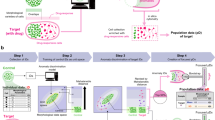 Prior to any measurement, the stability of our system i.e., the ability to maintain the media without evaporation for the duration of the measurements, was validated given the small size of the wells. The results as shown in Fig. S1, suggest a comfortable time window of 24 h prior to media evaporation which exceeds by far the measurement time scales. In a typical experiment, the microwell arrays are placed onto the AFM stage, and cells are pipetted on top as schematically depicted in Fig. 2a. The stage is kept at \(37^{\;\circ }\)C and submerged via periodic addition of fresh media. Substrates were replaced at regular intervals to avoid the buildup of salt, and no time-based trends were observed during measurements (see Fig. S3). After allowing a few minutes for the cells to settle, we observe the cells filling the traps as shown in the confocal image of Fig 2b as well as a significant number of them resting on the substrate as a result of the homogeneous treatment of the chip. Cell density was low enough that nearby cells did not interfere with measurements (significantly lower than indicated in Fig. 2b). Interference from neighboring cells, or motion of the target cell resulted in major irregularities in the AFM curves, however, these data represent a small proportion of the dataset and were discarded (see examples in Fig. S2a–k for good and discarded datasets). Traps are purposely designed to be slightly larger than the 12 µm diameter T-cells, but not large enough to accommodate more than a single cell. A small number of wells contained multiple cells, and were not used for measurements. The AFM probe is manually positioned over each cell using an optical microscope in conjunction with the AFM stage and the cells are compressed with the AFM cantilever to obtain a force-distance curve as shown in Fig. 2c. We have used a flat, tipless AFM probe with an angle of approximately 10 degrees. As demonstrated previously this angle has no significant effect upon the measurements within the constraints of the study, namely at low compression15. This step is repeated for multiple cells, across 4 conditions: control (prior to drug treatment) and after incubation with three different cytoskeletal drugs that are known to induce changes to the elasticity of the cells. The cell traps prevent non-adherent cells from sliding facilitating the collection of the AFM data without interfering with the motion of the cantilever or exerting excessive force on the cells, as might be possible if the cell was clamped or otherwise forcibly confined.