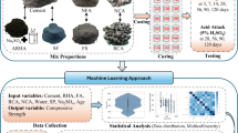 Nevertheless, the performance of RCA-based concrete particularly in terms of compressive strength and durability remains difficult to predict due to the complicated relationship that exists between the macro and micro properties of concrete and the prevailing environmental factors. To overcome this, we have used sophisticated artificial intelligence tools such as decision trees, XGBoost random forest, and ADA boost regression analysis for the prediction of conditions such as compressive strength and acid resistance of concrete. The proposed ML models have displayed robust performances through the identification of patterns within larger datasets for accurate prediction compared to conventional regression models24,25,26,27. Decision tree algorithms are easy to interpret and as such, when it comes to concrete performance the decision rules are easy to grasp hence providing a clear way of showing pre-determinants of performance. On the other hand, gradient boosting framework called XGBoost boasts high predictive power and practicality to solve several intricate data related issues frequently met in concrete research28. Random forests, an extension of the decision tree learning, apply decision trees in parallel to enforce low variance by combining multiple trees or decision trees to minimize overfitting29. Finally, AdaBoost regression is centered on adjusting the model to highlight specific situations that are challenging to forecast, enhancing the model’s general resilience30. Applying these machine learning methods makes it possible to analyze the degree of dependencies of compressive strength and durability on different factors, including the proportions of fly ash, nano-silica, and RCA. This systematic approach not only aids in identifying the optimal mix design but also enhances model reliability, thereby improving decision making in the design of high strength concrete. Despite advancements, limited research exists on the combining use of chemically activated fly ash and nano silica in RCA based concrete, particularly with Na2SO4 activation. RCA has affected the mechanical and durability properties of concrete, presenting significant challenges to its effective utilization in high strength concrete. The incorporation of SCMs such as nano silica and fly ash (chemically activated) provides a promising solution to these issues. In addition, the use of machine learning algorithms to predict compressive strength and durability enhances the understanding of the interaction between concrete constituents. This combined approach holds significant potential for the development of durable, high performance concrete suitable for diverse structural applications.