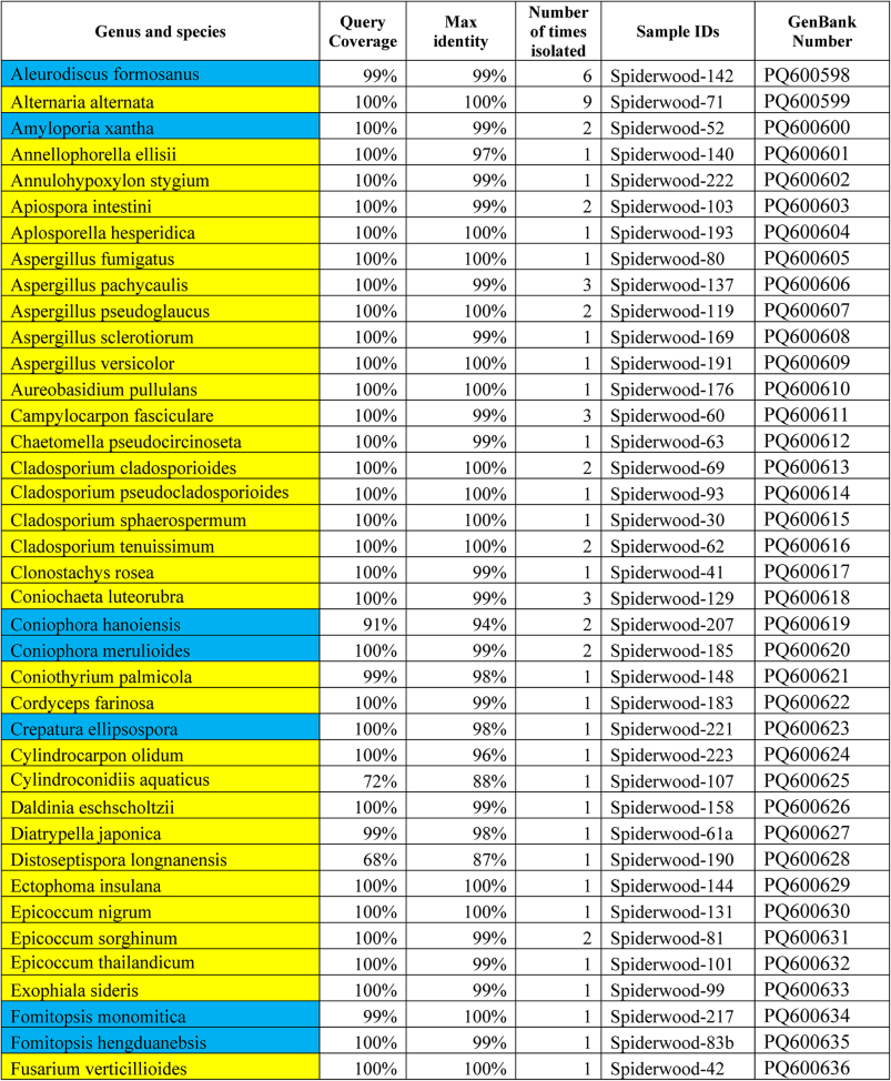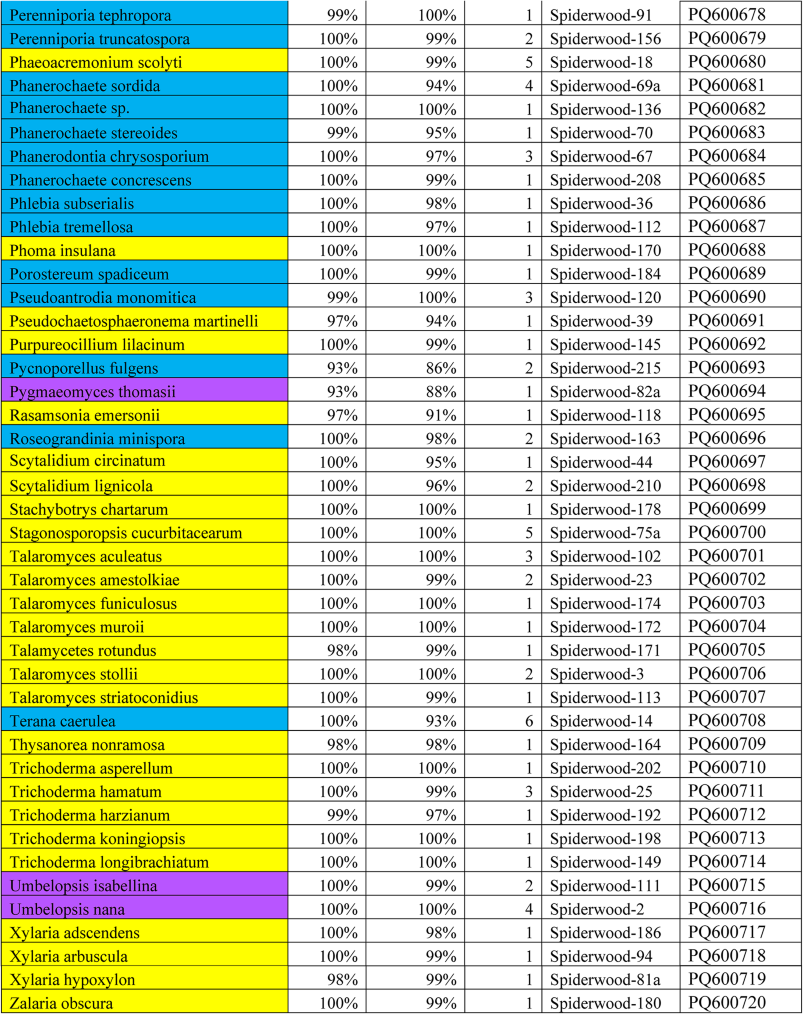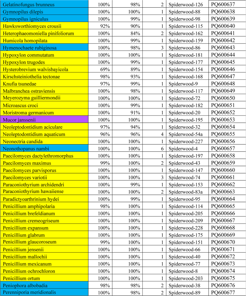 Table 1 Top Blastn results for ITS rDNA region, percent similarity to sequences in the GenBank database and GenBank accession numbers for fungi isolated from Asian wood purchased in the United States and sold for use in aquariums. Ascomycota represented in yellow, Basidiomycota in blue, Mucoromycota in purple.