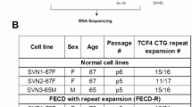 This study analyzed previously published RNA-Seq datasets and DEGs from corneal endothelial cells (CECs) of non-FECD and FECD subjects9,45. Analysis was restricted to FECD patients with trinucleotide repeat (TNR) expansion > 50 repeats, as confirmed by analysis of peripheral blood samples. Details of the control and FECD patient RNA-Seq datasets used in this study are as follows. Control samples were obtained from donor corneas of seven individuals (three Caucasian males and four Caucasian females, age range: 48–69 years)45. FECD patient samples were obtained from Descemet’s membranes containing corneal endothelial cells of six FECD patients with TCF4 TNR expansions who underwent corneal transplantation (three Caucasian males and three Caucasian females, age range: 53–79 years)9.