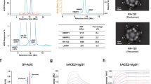 Wild-type human ACE2-Fc was isolated from agroinfiltrated N. benthamiana leaves by single-step affinity chromatography on immobilized protein A with yields of up to 650 µg per gram of leaf wet weight. Upon analysis by SDS-PAGE under reducing conditions, a major band of 116 kDa was observed (Fig. 1a; Supplementary Fig. 1). This agrees well with the theoretical molecular mass of the recombinant fusion protein (108 kDa without accounting for N-glycosylation). Consistent with Fc-mediated homodimerization, purified ACE2-Fc was largely in a dimeric state (73%). However, tetramers (9%) and higher oligomers (18%) were also detected by size-exclusion chromatography (Fig. 1b).