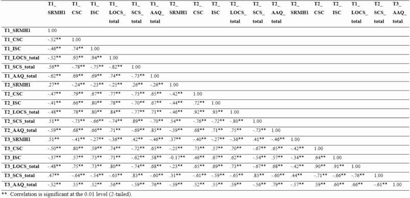 1. *p < 0.05, **p < 0.001, T1 = Time 1, T2 = Time 2, T3 = Time 3; CSC = Comparative Self-criticism; ISC = Isolated Self-criticism; SCS = Self-compassion; AAQ = Acceptance and Action Questionnaire (Psychological Flexibility); SRMH = Self-rated Mental Health.