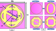 Within current research work, an MMA structure with broadband absorption is presented by Tran et al. Here, absorption is increased with the help of coding concepts in a wide frequency spectrum3. Likely, Lan et al. developed an absorber that exposes broadband absorption from 1.91 GHz to 20.78 GHz, including multilayer resistive elements, providing over 90% absorption4. In another work, broadband MMA is constructed utilizing a metal-dielectric multilayer with a cone-shaped structure that provides more than 90% absorption within 3.93 GHz to 6.05 GHz and 11.64 GHz to 14.55 GHz. Polarized insensitivity property is achieved by the circular symmetry nature of the design5. Additionally, circular ring-based MMA is presented by Ali et al., which exhibits multiband absorptions with an absorption rate of above 98% from 8 to 12 GHz6. In Ref.7, tree-based fractal MMA is described by Chen et al. that exhibits wideband absorption extending from 4.9 GHz to 13.2 GHz. Here, wide-band absorption is accomplished through implanting lumped resistances. A microwave MMA sensor has been introduced in Ref8 that can be used for power imaging in the ISM band. It exhibits 84.2% conversion efficiency with 11.8 mV across the Schottky diode. In another work, authors presented MMA targeting near unity absorption at 5 GHz as well as 2.4 GHz9. The MMA can be used for Wi-Fi radiation shielding. Several MMAs are reported in Refs.10,11,12,13,14 that exhibit multiband resonances targeting various applications. Nipun et al. present an MMA that operates at 5 GHz and 13 GHz with high absorptions. This MMA finds its application of EMI shielding at 5 GHz along with the sensing capabilities at 13 GHz15. Among other works, Mahfazur et al. present MMA with 98.88% and 99.81% absorption levels at 2.4 GHz and 5 GHz, which is suitable for sensing cooking oil impurities and EMI shielding16. MMA application is offered in Ref.17, where MMA is incorporated with an antenna for reduction of radar cross-section along with backward radiation with gain enhancement by 2.7 dB. Similarly, mutual coupling is reduced using MMA in the MIMO antenna system, where MMA assists 37 dB mutual coupling reduction with better imaging resolution18. MMA having high refractive index sensitivity and enhanced quantity factor (Q factor) is offered by Lateef et al. Q factor of 84.5 is realized by exercising an asymmetrical structure that makes absorption polarization-dependent19. An asymmetric MMA structure is also reported in Ref.20, where MMA is effective for energy harvesting. Moreover, the authors describe an MMA absorber operating at terahertz frequency consisting of two squared patches displaying near unity absorption at 1.9 THz and 2.45 THz21. On the other hand, the absorber in THz is reported by Zhang et al., where the phase transition property of VO2 is exercised to provide above 90% absorption within 3.25 THz to 7.08 THz22. Likewise, Bilal et al. have demonstrated MMA exhibiting absorption above 90% within 400 nm to 2800 nm23, and MMA presented by Hossain et al. operates in the visible spectrum that may be applied for energy harvesting24. In Ref.25, a dual-band absorber that operates in the Ku band shows the resonances at 12.45 GHz and 14.18 GHz, with a peak absorption of 99.73% and 99.87%. In another work, dual-band absorption is achieved using cut wire pairs conjoined over the substrate material, and vertical sliding provides frequency adjustment flexibility26. This technique helps the frequency splitting of absorption spectra in the S-band.