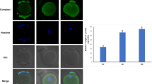 Cortical granule distribution in oocytes was assessed using Lens Culinaris Agglutinin (LCA) staining, as described in our earlier study19. Briefly, the oocytes were fixed in 4% PFA in PBS overnight at 4 °C. Subsequently, the oocytes were incubated in extraction buffer overnight at 4 °C, followed by incubation in blocking buffer (1% BSA, 0.01 M glycine, and 0.05% Triton X-100) at 37 °C for 1 h. The oocytes were then stained with 10 µg/mL of Rhodamine-LCA (Cat. No. RL-1042, Vector Laboratory, Inc., CA, USA) for 30 min at room temperature and thoroughly washed with PBS. After counterstaining with DAPI, the oocytes were mounted using Fluoroshield mounting medium (Cat. No. F6182, Sigma-Aldrich, USA). Oocytes were observed under confocal microscope (Leica SP8-DMi8 microscope, Germany), and the images were captured at 63 x oil immersion objective (630 x magnification) using Leica Application Suite X software. The percentage of oocytes with normal (peripheral and homogenous distribution) and abnormal (non-homogenous distribution) was calculated.