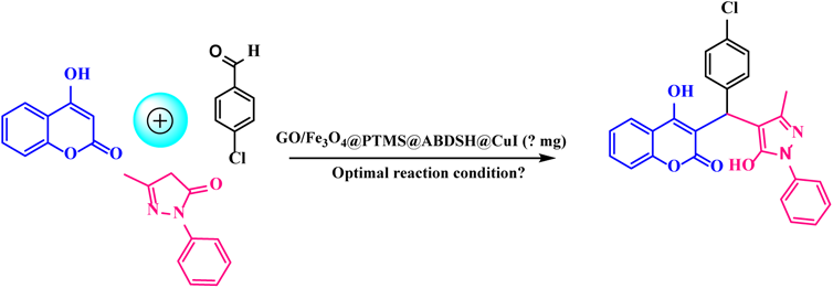 Table 4 Refining the reaction parameters for synthesizing 3-((4-chlorophenyl)(5-hydroxy-3-methyl-1-phenyl-1H-pyrazol-4-yl)methyl-4-hydroxy-2H-chromen-2-one derivative.