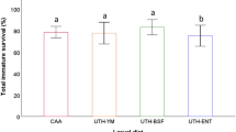 Each diet (500 g) was placed into clean plastic boxes (35 × 25 × 10 cm). 30 mixed-sex adults of yellow mealworm were placed into each rearing box to allow for mating and oviposition, and slices of fresh carrots or cabbage leaves were provided once a week. After 15 days, the adults were removed, and their larvae were collected using a sterile standard sieve for all rearing boxes. For all bioassays, plastic boxes remained until pupation at 26 ± 1 °C and 65 ± 5% R.H., in an incubator. Each diet box was replicated three times making 57 rearing boxes. The number of yellow mealworms produced, and the fecundity (number of young produced per female) were then assessed for each treatment. The fecundity (F) was calculated using the formula; F = NI / NF, where NI is the number of individuals produced and NF is the number of females. All the larvae produced in each treatment were weighed and measured for length at the beginning of the experiment, and their initial weight and length were recorded. The mortality%, duration and pupation% were determined for larvae, pupa and adults. After pupation, the emerged adults were counted for all diets.