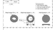 Recent research highlights the adaptation of Terzaghi’s capacity formula to various stability challenges, as demonstrated by Nguyen and Shiau24, Shiau et al.15. Their work introduces a comprehensive approach using three stability factors (Fc, Fq, and Fγ) to evaluate both static and seismic loads. These factors, consistent with Terzaghi’s framework, provide a unified method for assessing limit loads under seismic conditions. This approach integrates various factors, including soil properties, surcharge loading, seismic impacts, and wall roughness, facilitating a detailed analysis of ground anchor uplift behavior. Unlike other studies25,26,27, Shiau et al.15 present dimensionless factors that enhance practical design applications for plate anchors subjected to seismic loading. However, this approach has not yet been applied to axisymmetric anchors in frictional-cohesive soil with surcharge loading. This study seeks to bridge this gap.