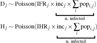For a department j, the counts of deaths (\(\text {D}_j\)) and hospitalizations (\(\text {H}_j\)) of the first semester were modeled with Poisson regressions: