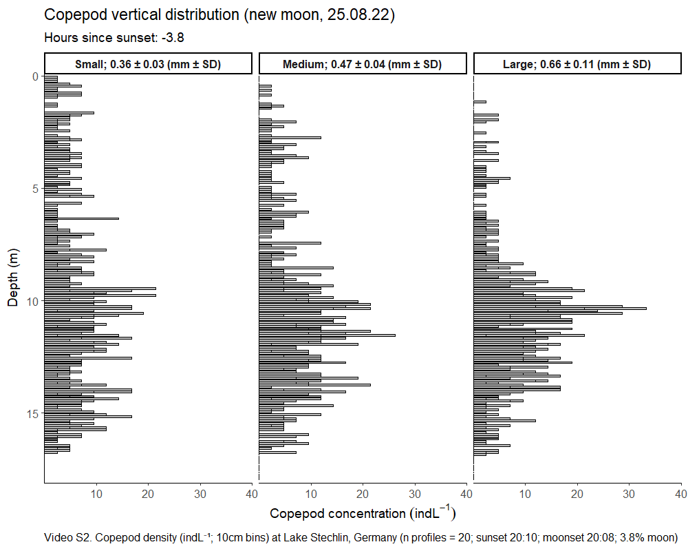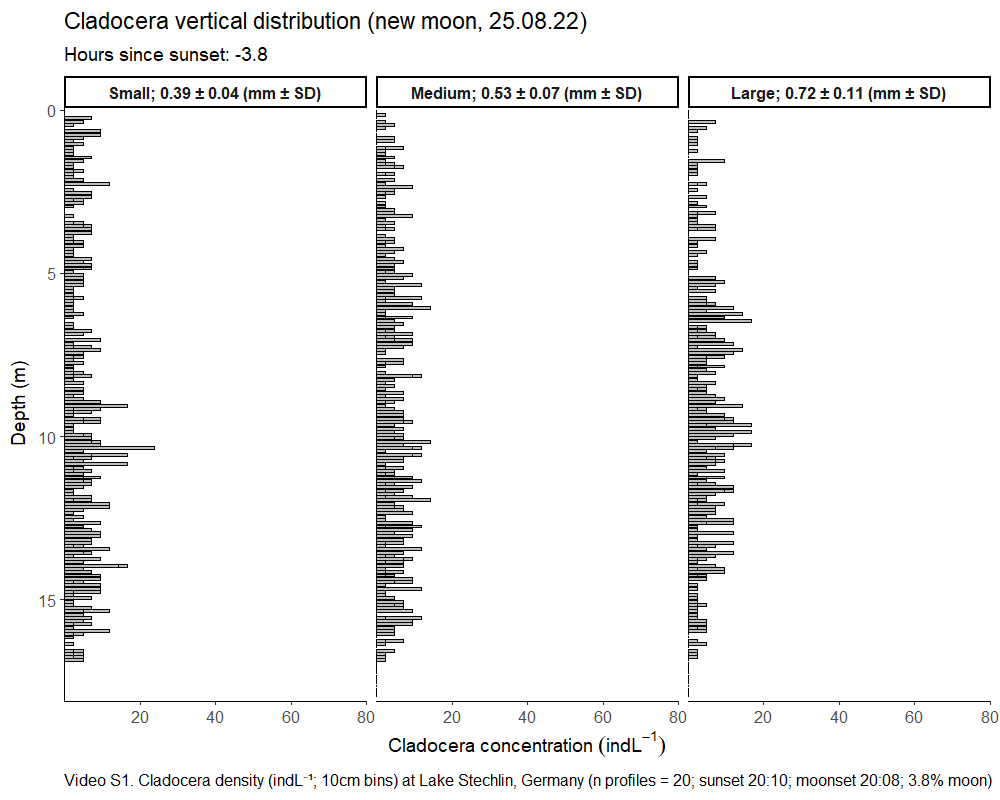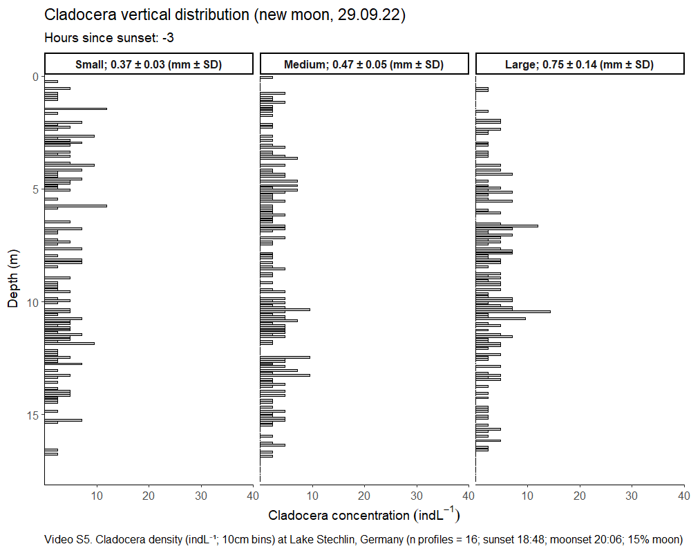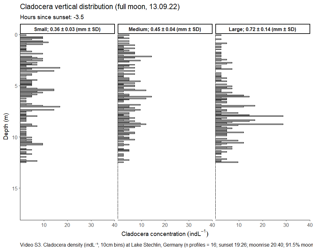 Our limited understanding of fine-scale DVM patterns partly stems from historical data-collection constraints, particularly for mesozooplankton1. Early net-tow methods provide only coarse estimates across metre-scale depth strata, whereas freshwater zooplankton interact with prey and predators over millimetres to centimetres and on minute-to-second timescales. Manual, labour-intensive net and microscope approaches therefore lack the spatial and temporal resolution required to capture such fine-scale behaviours. Acoustic sampling improves spatial resolution and, with broadband acoustics, can differentiate zooplankton groups across size classes based on spectral backscatter28, but cannot reliably identify individual taxa or measure biological traits such as body size or developmental stage. Underwater imaging, particularly the modular Deep-focus Plankton Imager (mDPI), provides images with a practical resolution of 30–60 μm, allowing accurate identification of crustacean zooplankton larger than ca. 300–400 μm across the whole 10 cm depth of field (see Fig. 8 in Greer et al. 2025). This relatively high practical resolution is critical as most crustacean that dominate freshwater systems, like Lake Stechlin13, are smaller than ~ 1 mm. The mDPI also enables automated acquisition of large datasets and, when combined with automated image recognition algorithms, facilitates detailed studies of DVM by specific taxa and size classes1,29,30,31. These technological advances now allow unprecedented insights into how subtle light variations, including moonlight, shape zooplankton vertical migration.We used a mDPI to profile zooplankton vertical distribution in Lake Stechlin, Germany, a clear, deep, temperate lake with an abundant zooplankton community and high densities of planktivorous fish32,33. We conducted high-resolution sampling of zooplankton across diel periods during both new- and full-moon phases, alongside measurements of temperature and chlorophyll-a (as a proxy for food availability). Our aim was to assess how light influences DVM, with a particular focus on size-specific behavioural responses. We expected to observe classic DVM patterns, with zooplankton migrating to deeper water layers during the day to avoid predators and harmful UV exposure, and ascending at night to exploit warmer, food-rich surface waters. We further hypothesised that responses to nocturnal light would vary with body size. Smaller zooplankton, being less detectable to visual predators, were expected to show limited migration and instead remain in zones with favourable food and temperature conditions. In contrast, we expected that larger zooplankton would exhibit more pronounced DVM, retreating to deeper water layers during moonlit nights to reduce light-mediated predation risk. By examining these size-specific vertical migration behaviours, our study provides new insight into the trade-offs underlying DVM under varying nocturnal light conditions.