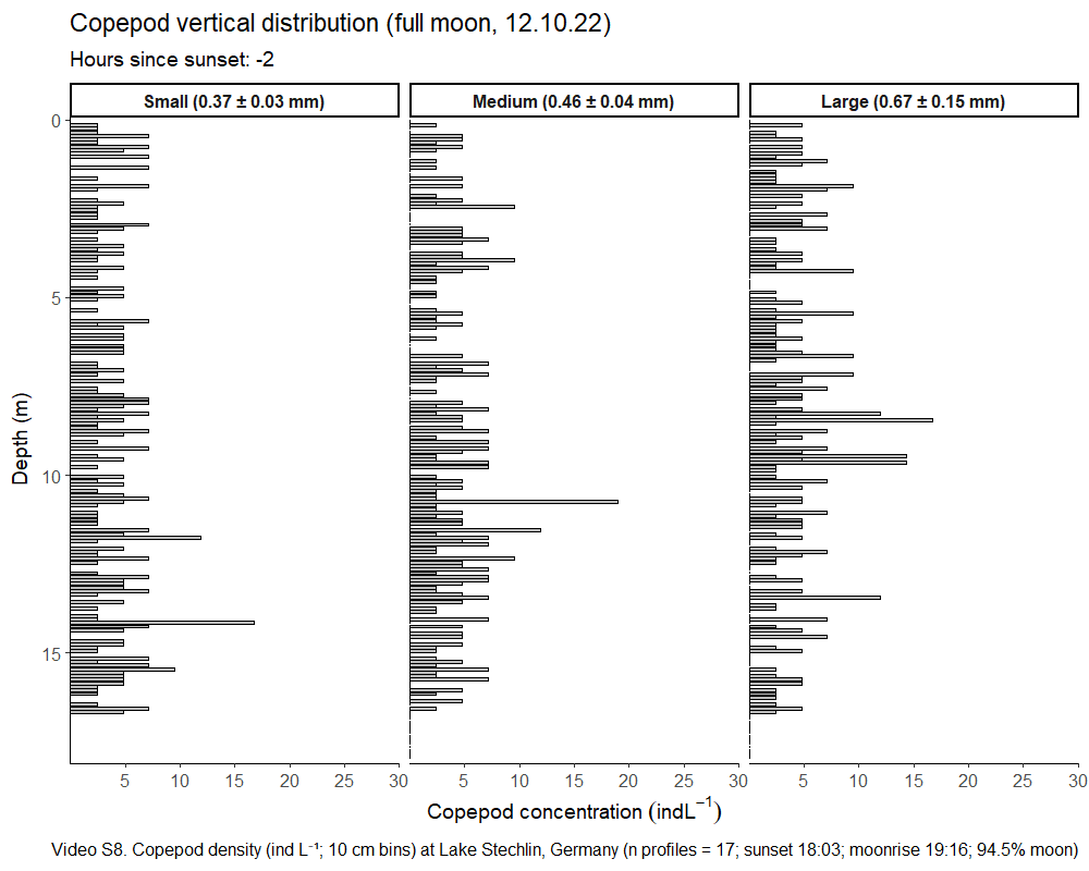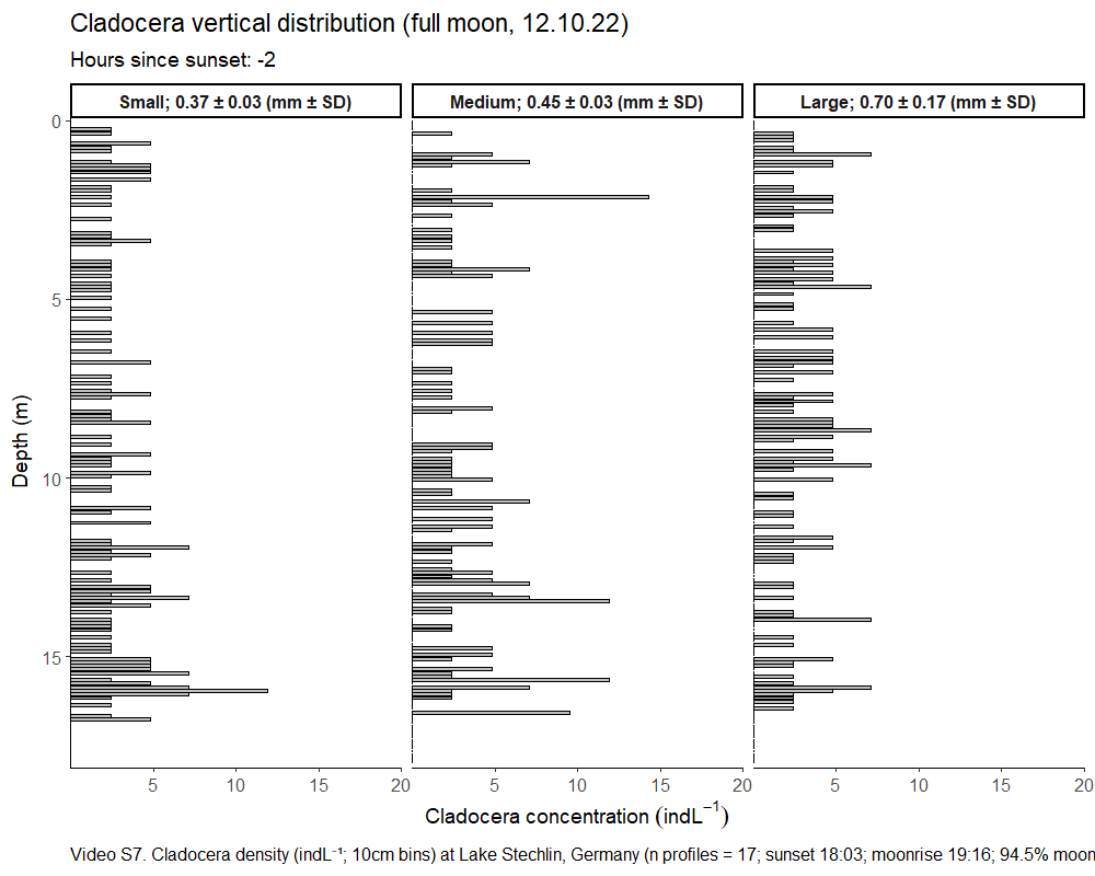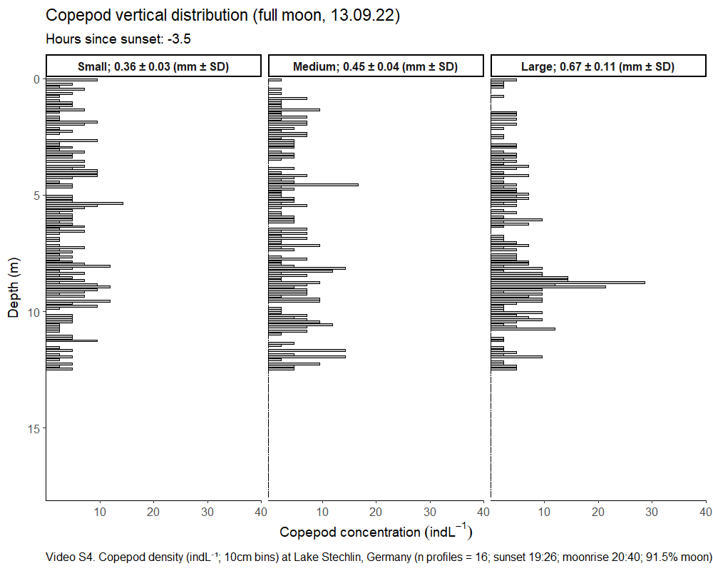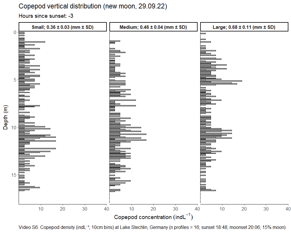 To classify zooplankton into size categories (small, medium, and large), we used the ESD. The ESD values were converted into millimetres using a pixel size of 21 μm (divided by 1000) and were subsequently used to categorise the size histogram into three distinct size classes for cladocerans and copepods separately. For cladocerans, small individuals ranged from 0.36 to 0.39 mm, medium from 0.45 to 0.53 mm, and large from 0.70 to 0.75 mm. For copepods, small individuals ranged from 0.36 to 0.37 mm, medium from 0.45 to 0.47 mm, and large from 0.66 to 0.68 mm (Supplementary Table S1). Density (ind*L−1) of each size class for both taxa was calculated within 10 cm vertical bins throughout the water column, resulting in 167 bins per profile. The density of zooplankton within each bin was used for analyses. This 10 cm bin resolution balances small-scale vertical resolution while still maintaining a meaningful number of zooplankton within each bin.