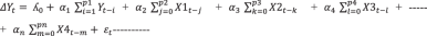 Therefore, a general ARDL (p0, p1, p2, p3,…, pn) model for one dependent variable Y and a set of independent variables X1, X2, X3,…, Xn, in which p0 is lag of dependent variable and p1–pn are lags of the independent variable can be written as follows: