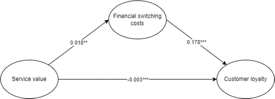 Service value → Financial switching costs → Customer Loyalty | 0.029 | 0.018 | Partial mediation | |