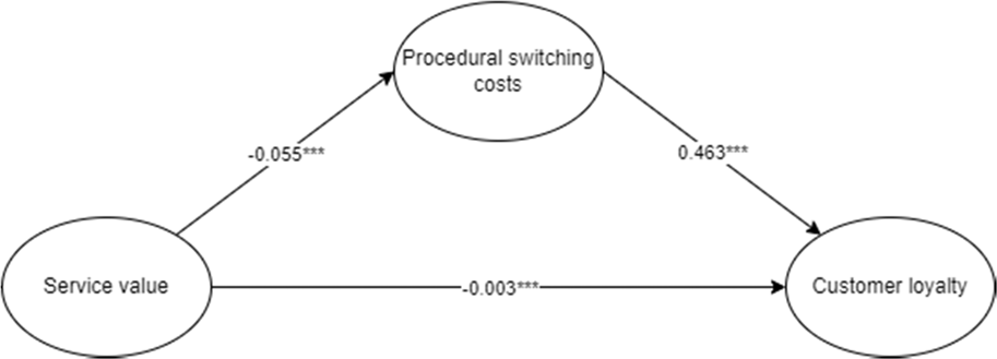 Service value → Procedural switching costs → Customer Loyalty | 0.093 | 0.004 | Partial mediation | |