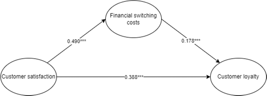 Customer satisfaction → Financial switching costs → Customer Loyalty | 0.061 | 0.007 | Partial mediation | |