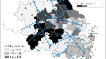 Xit is a collection of control variables, which includes: ①The economic structure can be assessed by the percentage of the secondary industry’s output value in the GDP. ②The consumption scale is determined by the ratio of retail sales of consumer goods to GDP. ③The scale of government, which can indicate the level of government involvement in the social economy, is determined by the ratio of general government fiscal expenditure to GDP. ④The level of human capital is a significant factor that influences marginal output, as indicated by the number of primary and secondary school students per 10,000. ⑤The measurement of resources and environment is determined by the amount of green space per person. δi, the regional-fixed effect, is a consistent factor that remains unchanged over time and has an impact on the result. The time-fixed effect μt is utilized to manage the impact of time-varying factors. εit represents the perturbed term. In Eq. (10), where \({\it{\epsilon }}\sim iid\left( {0,\quad \sigma _{\it{\epsilon }}^2I} \right)\), In represents elements of N × 1 and 1 column, and \(\mathop {\sum}\nolimits_{j = 1}^n {W_{ij}\varepsilon _{it}}\) represents the interaction effect of the disturbance.