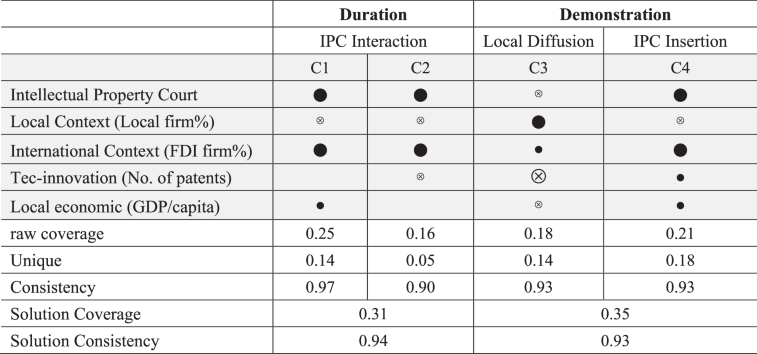 1. Large filled-in circles () = core present conditions, their presence is crucial for the outcome; Large crossed circles (\(\bigotimes\)) = core absent conditions, their absence is crucial for the outcome; Small filled-in (•) and crossed circles (\(\otimes\)) = present or absent conditions, supportive but not essential conditions; Blank fields = irrelevant conditions.