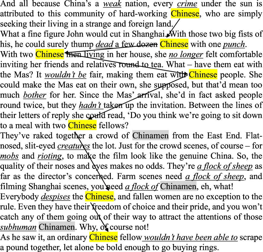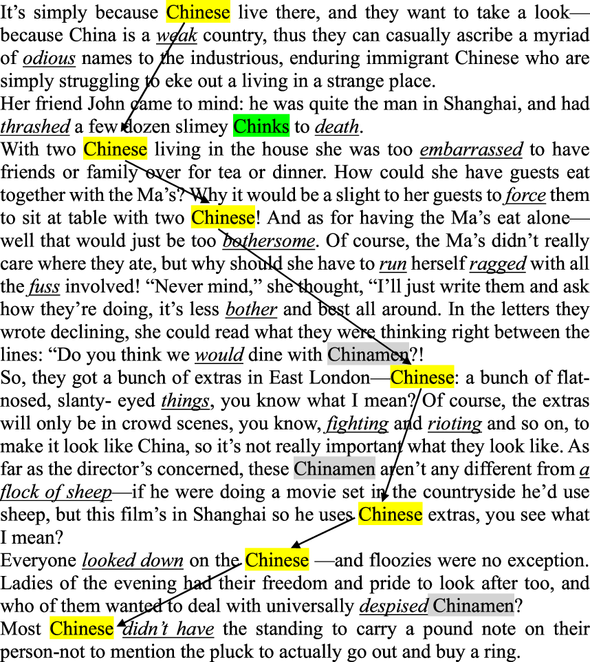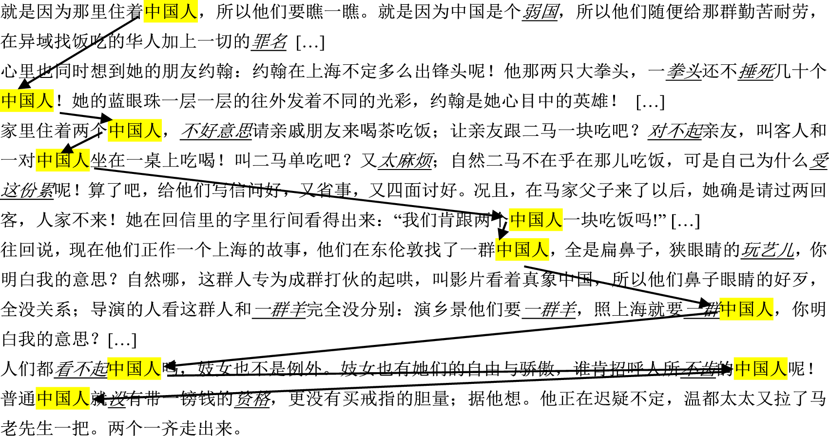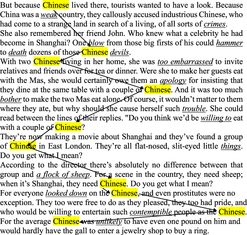 Example (5) demonstrates the original lexical chain (black arrows) created by “中國人” across six randomly-sampled paragraphs from the source text. These selections represent every 24th paragraph from the 144 containing this thematic word, presented in their original sequence with the term highlighted in yellow and relevant collocates italicized. This lexical chain establishes a cohesive pattern consistently conveying negativity toward diasporic Chinese. The first, fifth, and sixth paragraphs pair the thematic word with collocates like “弱國” (weak nation), “罪名” (accusation), “不齒” (disdain), and “沒…資格” (unqualified), all expressing British contempt. The second paragraph combines it with “拳頭” (fist) and “捶死” (beat to death), reflecting vehement British aversion. The third paragraph’s repeated occurrences evoke troubled sentiments toward Chinese people, while the fourth paragraph conveys dehumanization. Together, these paragraphs create a coherent negative portrayal of the Chinese diaspora in Er Ma.