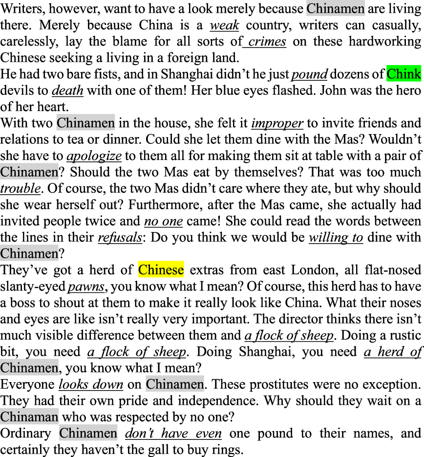 The first semantic, labeled as General Negativity, portrays Chinese diaspora as sick and unpleasant. For “黃臉”, collocates include “又黃又腫” (yellow and swollen) and “抽大煙” (opium smoking); for “中國人”, collocates include “討人嫌” (annoying) and “髒臭” (dirty and smelly).