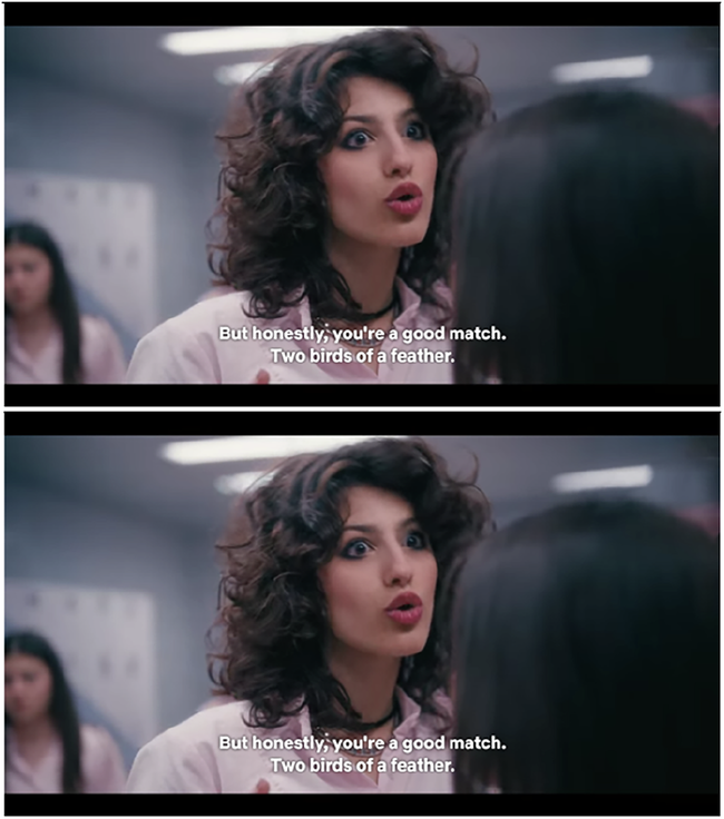 Interactive | A zoom-in close-up shot. Hiba, Shams, and Nadeen are in the locker room. Hiba is surprised by the fact that they have become friends. Character’s behavior: Hiba: wide-open eyes, wide-open mouth. Volume: medium. Tone: sarcastic. |
