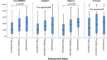 Work-related difficulties were measured using the Multiple Sclerosis Questionnaire for Job Difficulties (MSQ-Job) (Raggi et al. 2015). The MSQ-Job is made up of 42 items forming six subscales and an overall scale, with scores ranging from 0 to 100, where higher scores indicate more severe problems with work-related activities. The questionnaire is intended to capture the individual’s perceived difficulties with work-related tasks and includes both MS-related (physical and mental) and company-related difficulties. Two subscales of the MSQ-Job, namely ‘Tactile perception and fine movement’ and ‘Movement and fatigue-related body functions’, address areas of physical health that can affect work-related activities. A further two subscales address issues related to mental health and relational aspects, respectively ‘Fatigue-related mental functions and symptoms’ and ‘Psychological and relational aspects’. The last two subscales, ‘Time and organisational flexibility in the workplace’ and ‘Company’s attitudes and policies’, address difficulties due to features of the workplace as perceived by the person with MS. A score higher than 15.8 is indicative of the presence of severe work-related difficulties (Schiavolin et al. 2016).