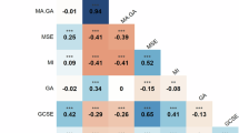 We checked multivariate normality with five variables used in the path analysis model for statistical validity. In univariate normality, no variable’s skewness and kurtosis are below −1 or above 1. However, based on Mahalanobis distances, six students showed extreme values (i.e., their \({\chi }^{2} > 11.07={\chi }_{5}^{2}\)). We carefully observed all six students’ data but found no coding errors; thus, we included the six cases in further analysis. Variance inflation factors for multicollinearity among five variables were less than 5, indicating no multicollinearity issues. After confirming these assumptions, we fit the path model (see Fig. 1) to our data. The hypothesised model (Fig. 1) was selected based on the literature as well as exploratory model comparison. Four models were compared: a full model with both direct effects of growth mindset to math achievement and intrinsic motivation, a model with one direct effect of growth mindset to math achievement, a model with one direct effect of growth mindset to intrinsic motivation, and a simple model without the two direct effects. Model comparisons were conducted with the likelihood ratio difference test (LRDT). No comparisons were statistically significant. For example, the comparison between the full model with both direct effects and the reduced model (our hypothesised model) indicated no significant difference between the two models, which suggested that the reduced model was the best-fitting model (LRDT statistic =0.934 ~ \({\chi }_{2}^{2}\) and p-value = 0.627).