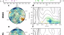 The atmospheric conditions corresponding to the largest anomalies in total Arctic land vapor parallel the necessary atmospheric conditions for anomalies in CER and EER vapor as shown in the composite analysis (Fig. 7 and Supplementary Fig. 6). Indeed nearly all of the years with high total Arctic land vapor coincide with years of high EER and/or CER vapor. Almost all of the additional land vapor entering the Arctic during anomalously high vapor years is sourced from either HIL or HML further indicating that SLPs largely control HIL vapor and GPH fields control HML vapor. For the anomalously high Arctic land vapor years, SLPs are lower than normal on the central and east Eurasian side of the Arctic and the 500 mb GPH fields align along the 90°E-90°W axis (Fig. 9). This pattern emerges during the positive phase of the Arctic Dipole (AD) anomaly27,28,29. Studies have suggested the circulation anomalies associated with the positive AD phase enhance heat and moisture transport to the Arctic from the North Pacific30, but the role this mode of variability has on transporting land-sourced vapor has not been explored. The moisture tracking analysis presented here suggests the positive (negative) AD phase provides the optimal atmospheric conditions for enhanced EER/CER (ENA) poleward flow, thus enhancing total Arctic land vapor (Fig. 9 and Supplementary Fig. 18). While the positive (negative) AD phase closely matches the composite SLP and GPH conditions for enhanced EER/CER (ENA) vapor, given the simultaneous occurrence of other modes of variability (e.g., the Arctic Oscillation), and ET anomalies, not all positive and negative Arctic Dipole years induce anomalously high and low land vapor advection from these continental regions. However, the connection between the AD anomaly and anomalous land vapor transport from the high moisture region of EER may help to explain anomalously warm conditions in the Arctic during some positive AD years.