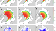 where \(q\) is the positive of the enthalpy of the bottom ice layer (\({\rm{W}}\) day cm-3), denoting the energy needed to melt a unit volume of sea ice60. \({F}_{{cb}}\) is the downward conductive heat flux from the ice top to the ice bottom surface (\({\rm{W}}\) cm−2), and \({F}_{{bot}}\) is the downward heat flux from the ice to the ocean (\({\rm{W}}\) cm−2). If \({F}_{{cb}}\) (\({F}_{{bot}}\)) is negative, the flux is transferred from the ice bottom to the top surface (from the ocean to the ice). In other words, if \({F}_{{cb}} > {F}_{{bot}}\) (i.e., the transfer of the energy to the upper sea ice is lower than the input of the energy from the sea ice bottom), ice melting occurs at the bottom surface \(({meltb} > 0)\). The ice bottom melting increases (i.e., increase in \({meltb}\)) when the input of the heat flux increases (i.e., increase in \({F}_{{cb}}-{F}_{{bot}}\)) and/or the energy needed to melt decreases (i.e., decrease in \(q\)).
