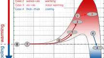 Current understanding of microphysical processes in anvil and TTL cirrus is incomplete, preventing robust quantification of how tropical cirrus clouds respond to global warming30,31. Tropical cirrus evolve at colder temperatures and lower pressures than assumed in the previous scenarios, causing significant reductions in the amount of H2O available for deposition and growth rates per ice crystal, in turn causing larger nucleated ICNCs and smaller mean ice crystal sizes (Table 1). Fewer ice crystals settle out of freezing layers. The relative ICNC dispersions in scenarios Anvil (≈33%) and TTL (≈36%) are similar to Base.