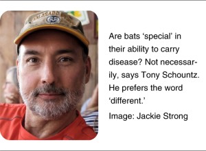 However, it remains controversial whether this viral richness arises from unique features of bat immunology and physiology, or merely from bats’ capacity to acquire exotic viruses from far and wide and deliver them to human communities. “The word ‘special’ implies that there’s something that makes them better at this, and I don’t think that’s the case—I prefer the word ‘different’,” says Tony Schountz, a microbiologist at Colorado State University. Special or not, researchers are struggling to fill in the blanks about bat biology, and hunting for insights that might clarify why and how bat-borne infections make the leap into humans, and to such deadly effect.