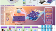 Increasing awareness of personal health conditions is rapidly promoting the development of point-of-care technologies for early diagnosis of diseases. Breath analysis is an important candidate among the various diagnostic technologies available.1,2 This is due to its non-invasive approach for detecting unique chemical signatures that can be correlated with specific diseases.1,2 Among the various species in exhaled breath, ammonia (\({{\rm{NH}}}_{3}\)) is a critical biomarker associated with a range of kidney and liver disorders.2,3 The new generation \({{\rm{NH}}}_{3}\) diagnostic systems rely on the development of low-cost, miniaturized devices in which semiconducting metal oxides (MOx) are commonly utilized as the sensing layer among chemiresistive sensors.4 In particular, ZnO has been long exploited for \({{\rm{NH}}}_{3}\) detection due to its strong response compared to other MOx materials.5,6 However, devices with MOx as the active sensing layer often requires continuous operation at elevated temperatures which not only consumes high power but also deteriorates material’s structural stability, leading to shortened lifetime and compromised responses.7 Incorporation of atomically thin graphene into MOx matrix has recently attracted strong interest due to its excellent sensitivity to environmental perturbation8 and low work function,9 enabling lower operating temperatures.10 The graphene–MOx hybrids reported to date exhibit improved responsivity11 which is attributed to the formation of local metal–semiconducting (M–S) heterojunctions.12,13 They also show enhancement in gas adsorption capability at the active graphene sites.12,14 Despite the improved responsivity, critical issues common to chemiresistive sensors, such as high power consumption, long recovery time,15,16,17 severe baseline drift,11,14,17 low signal-to-noise ratio (SNR) and unstable responses,11,14,17 poor device-to-device consistency,18 interference with volatile organic compounds (VOCs)9 and water vapor,19 remain unresolved. Limited attempts based on dynamic control of operating temperature have been applied to improve detection limit,20 baseline drift,21 cross-selectivity,22,23 and power consumption of MOx and 2D material gas sensors. However, these approaches have not been sufficiently effective to resolve the issues,21 and lack systematic and quantitative experimental support.20,21 This has inhibited a satisfactory understanding of the underlying mechanisms and their interplay. The aforementioned challenges all hinder diagnostic applications2 and cannot be easily addressed through the sensing material alone.1,2 Instead, a holistic solution is necessary to realize devices suitable for personal healthcare monitoring.