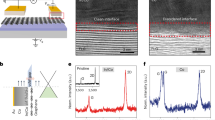 To assess the interface contact quality within the junction, electrical measurements were conducted through the NiFe contact, circumventing the NiO pinning layer (Fig. 2(a,c)). The current-voltage characteristics for both devices demonstrate Ohmic contact at both room temperature and 10 K, indicating a metallic interfacial contact forms at the junction (Fig. 2(e, f))27. This electric behavior emphasizes efficient charge carrier injection and minimal resistance at the interface. Moreover, the absence of a tunneling barrier, together with the observed linear I–V characteristics, is consistent with the presence of giant magnetoresistance (GMR)-type transport. This result provides new evidence for a previously observed ambiguity in the application of 2D materials in spintronic devices. Some studies have reported that graphene behaves as an insulator due to the momentum mismatch of the Fermi spheres of graphene (which is centered around the K points) and the ferromagnet, resulting in tunneling transport54,55,56. Conversely, other studies suggest that this structure functions as a spin valve due to graphene’s inherent conductivity, and changes in the transport are due to the GMR effect27,29,40,45,57. Our results confirm that even in the absence of interfacial contamination or magnetic pinning, the GMR effect is dominant throughout the investigated temperature range.