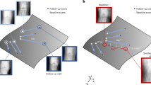 Siamese neural networks take two separate images as inputs, and pass them through identical neural subnetworks, which are joined at the output9. A convolutional Siamese neural network was built using two identical ResNet-10118 subnetworks with shared weights, pre-trained on the ImageNet data set for increased stability of training27. ResNet-101 was selected for its optimal performance after empirically testing ResNets-18, 34, 50, 101, and 152. The final fully connected layer of ResNet-101 was modified to output three or five nodes from both subnetworks, for the retina and knee algorithms, respectively (~42.5 × 106 total parameters in both models). Given image input vectors X1 and X2, the Euclidean distance Dw between the subnetwork outputs, Gw(X1) and Gw(X2), can be calculated \(\left( {D_{\mathrm{w}}\left( {X_1,X_2} \right) = ||G_{\mathrm{w}}\left( {X_1} \right) - G_{\mathrm{w}}\left( {X_2} \right)||_2} \right)\)12. The neural network parameters were trained using the contrastive function \(\left( {L = \left( {1 - Y} \right)D_{\mathrm{w}}^2 + \left( Y \right)\{ {\mathrm{max}}\left( {0,m - D_{\mathrm{w}}} \right)\} ^2} \right.\) ; Y = 0 if same class (i.e., no change) and Y = 1 if different class (i.e., change), and m = margin)12. The contrastive loss function is minimized if there is a small Dw for no change and large Dw for change. The margin was empirically set to 2.0 and indicates the maximum Dw at which dissimilar paired inputs will not contribute further to the loss, which helps to stabilize the loss function in training. Implementation of this Siamese network architecture was performed using the Python package PyTorch, using the Adam optimizer28 (initial learning rate = 0.000005, β1 = 0.9, β2 = 0.999), batch sizes of 16 for training and validation, and early stopping of training when the validation loss showed no further improvement after three training epochs. The network parameters from the model with the lowest validation loss were saved for testing evaluation.