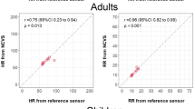 With tests in multiple postures and under different breathing exercises, we have performed analyses of 100 experiments, with over 590 min of total recorded data for 20 participants. Figure 3 shows the results across all three postures, with different breathing styles. We can achieve a high correlation of NCS and BIOPAC for RV \((r_{{\mathrm{RV}}} = 0.84)\), RR \((r_{{\mathrm{RR}}} = 0.93)\), and HR \((r_{{\mathrm{HR}}} = 0.95)\), as shown in the scatter plots in Fig. 3a–c. We have employed the Bland-Altman (\(B\& A\)) plot to quantify the agreement between NCS and BIOPAC, both of which may have errors. This agreement is estimated by the mean \((m)\) and standard deviation \((\sigma )\) of the measurement differences. \(B\& A\) plots can also identify possible outliers visually by a \(XY\) scatter plot, with the \(Y\) axis as the pairwise difference, and the \(X\) axis as the mean of the two measurements. The systematic bias is estimated as the mean difference \(m\), and limits of agreement (LoA) within which 95% of the differences are expected to lie, are estimated as \({\mathrm{LoA}} = m \pm 1.96 \cdot \sigma\), assuming a normal distribution. Figure 3d–f show good agreement of both the sensors with low mean deviations (\(m_{{\mathrm{RV}}} = 9.6\) mL, \(m_{{\mathrm{RR}}} = 0.05\) BPM, \(m_{{\mathrm{HR}}} = - 0.5\) BPM) and narrow LoA, as denoted by the dashed lines around the mean value. The results for each participant individually are shown in Supplementary Table 1.