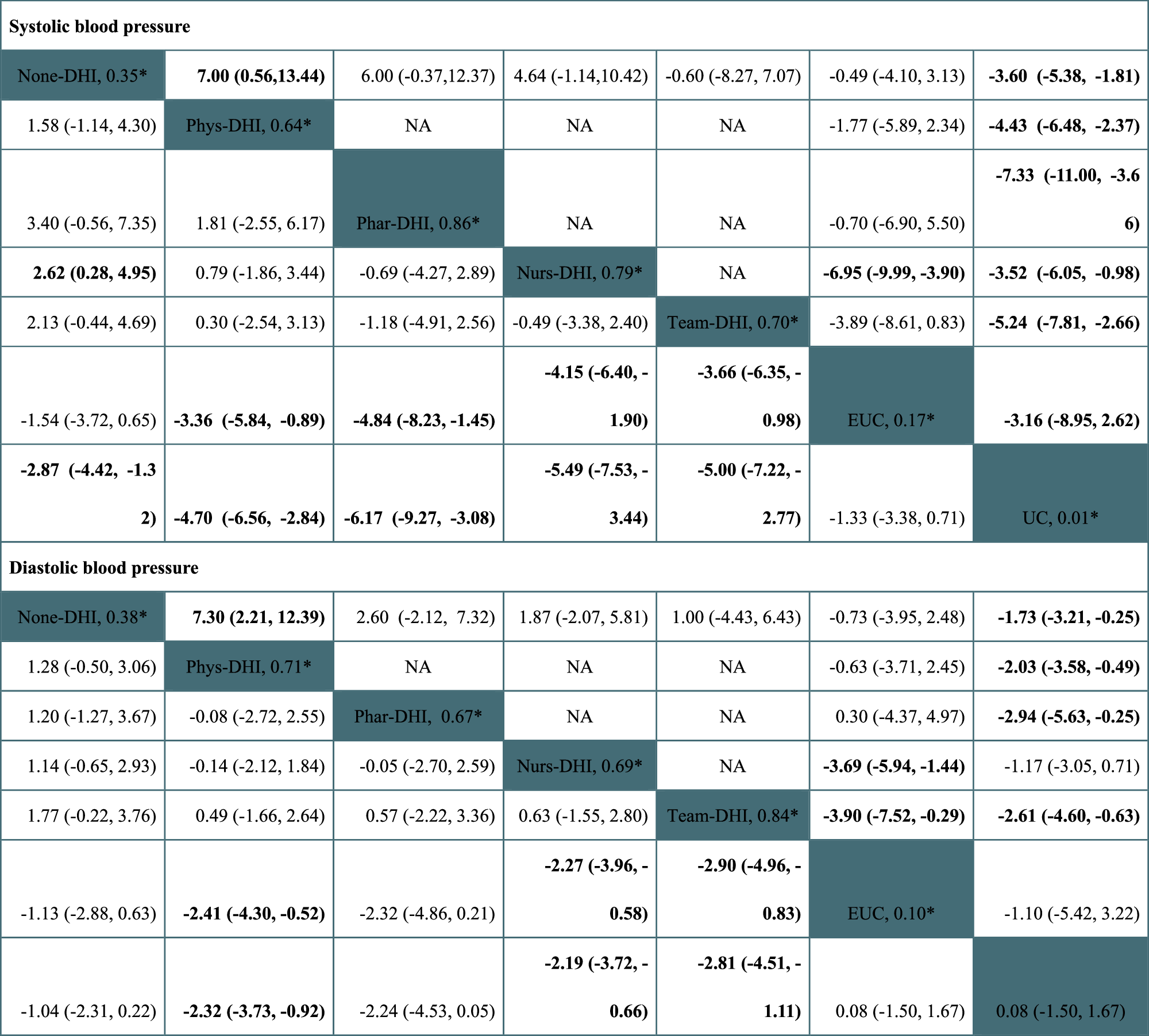 1. Note: None-DHI, the patient self-care digital health intervention with no healthcare practitioner involvement; Phys-DHI, the patient self-care digital health intervention with physician involvement; Nurs-DHI, the patient self-care digital health intervention with nursing staff involvement; Phar-DHI, the patient self-care digital health intervention with pharmacist involvement; Team-DHI, the patient self-care digital health intervention with multidisciplinary team involvement; EUC, enhanced usual care; UC, usual care; NA, not available. The upper right triangle is the pooled mean difference for pairwise comparisons and the lower left triangle is the pooled mean difference for network meta-analyses. *Sign indicates surface under cumulative ranking curve value, with 95% confidence interval shown in brackets. Bold fonts indicate statistically significant differences.
