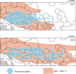 Cooperative management of the purse-seine fishery has also enabled tuna-dependent economies to adapt to the profound effects of the El Niño–Southern Oscillation (ENSO) on the extent of the western Pacific warm pool (‘warm pool’) and the associated distribution of the abundant skipjack tuna5,6 (Box 1). However, the realization that climate change will alter the tropical Pacific Ocean, and cause further modifications to ENSO7,8 and the warm pool (Supplementary Note 5), has prompted the regional organizations assisting Pacific SIDS to manage their tuna resources, the Pacific Community, Pacific Islands Forum Fisheries Agency and WCPFC, to support modelling of the effects of climate change on tuna biomass9,10,11,12. This modelling, which focused mainly on the EEZs of Pacific SIDS, projected progressive redistribution of tuna biomass in equatorial waters to the east and, to a more modest extent, to higher latitudes. Provided tuna biomass remains high within the combined EEZs of PNA participants, the provisions of the VDS (Box 1) are expected to limit the implications of climate-driven tuna redistribution for tuna-dependent economies and the goals of the Roadmap.